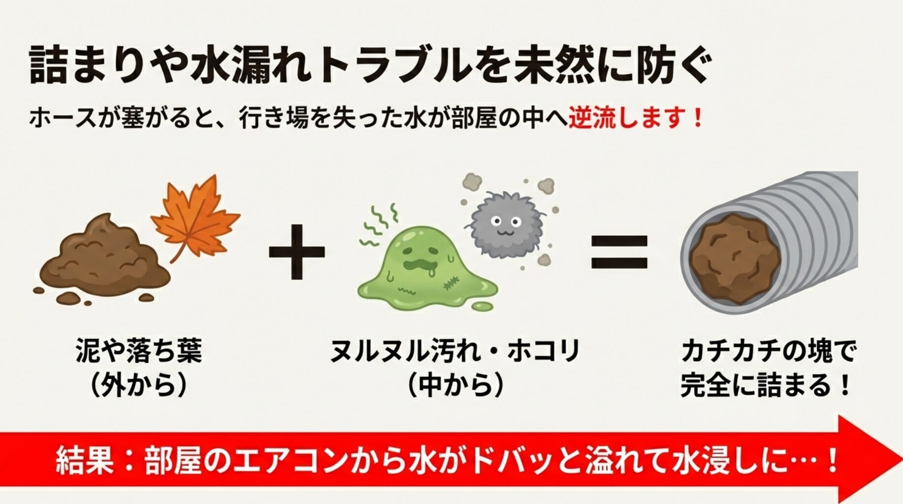 夏季に激増する漏水修理の多くが、この「ホース先端の接地状態」から始まっています。大切な家財と快適な生活を守るためにも、ドレンホースは絶対に地面につけない配慮が必要不可欠ですね。