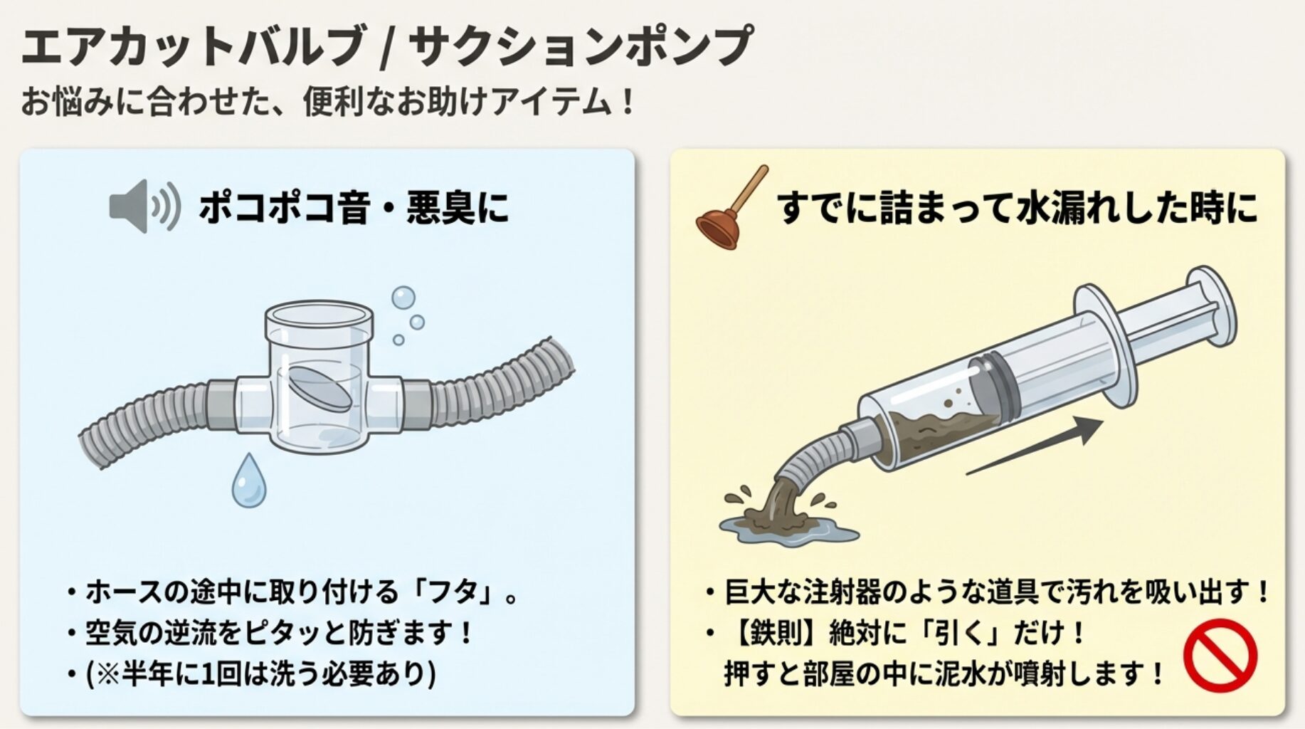 - ドレンホースを地面につけることで起きるトラブルの仕組みがわかる