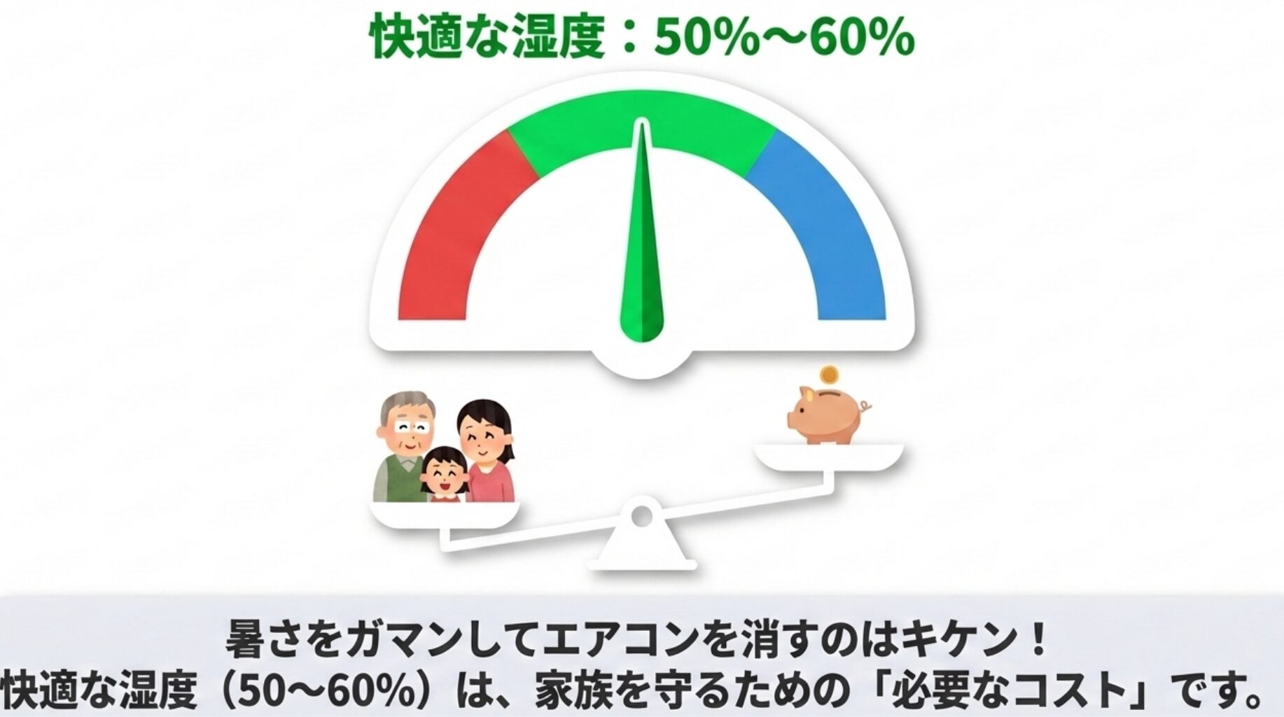 特にご高齢の方や小さなお子様がいるご家庭では、快適な湿度(50%〜60%)を維持するための必要経費と割り切ることも大切です。