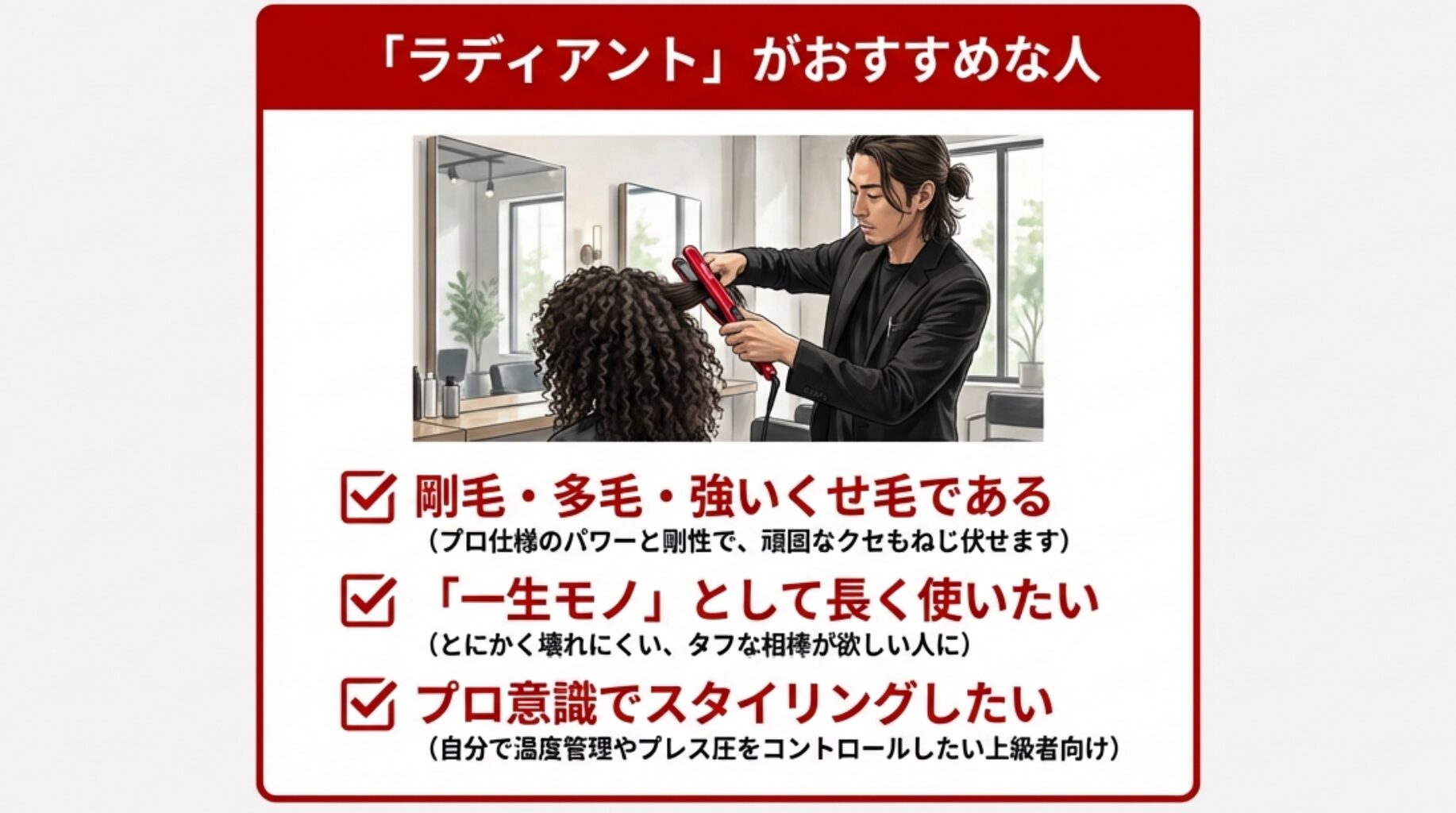 「普通のアイロンじゃクセが伸びない!」という方。ラディアントの剛性の高いプレートと、センサーレス制御による圧倒的な復熱スピードは、頑固なクセ毛をねじ伏せる力を持っています。特に35mmのワイドプレートモデルが選べるのはラディアントだけの特権です。